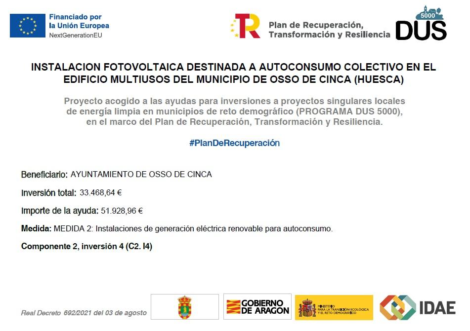 Con una subvención concedida del 85 % de los gastos subvencionables por la convocatoria Programa de ayudas para inversiones a proyectos singulares locales de energía limpia en municipios de reto demográfico (PROGRAMA DUS 5000) en el marco del Programa de Regeneración y Reto Demográfico del Plan de Recuperación, Transformación y Resiliencia, siendo el expediente, MEDIDA 2: Instalaciones de generación eléctrica renovable para autoconsumo es el PR-D5000-2021-002960.